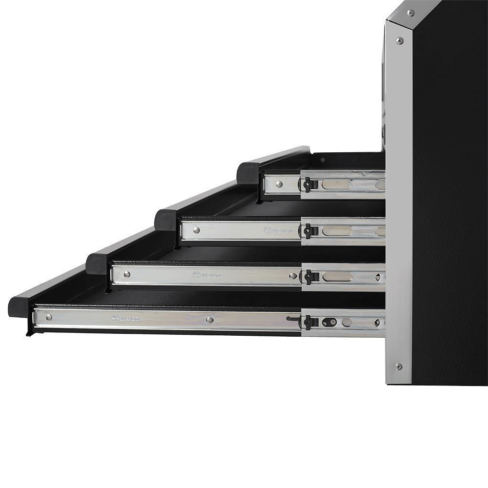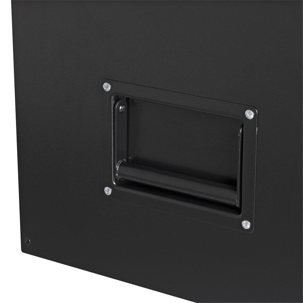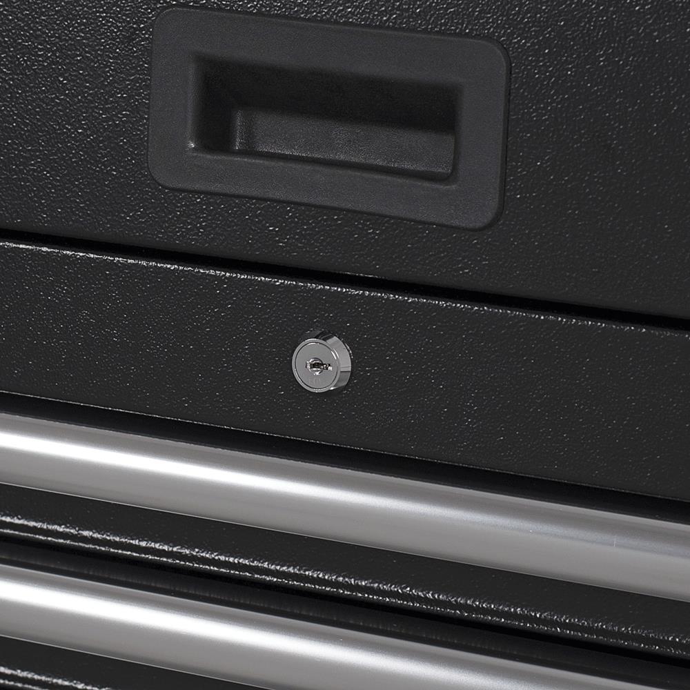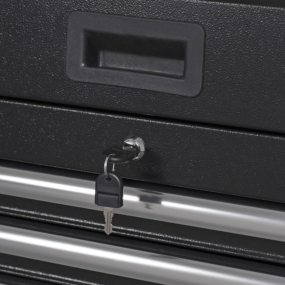 Made with a double wall 18 ga steel construction to withstand the heaviest loads Tough and durable oven-baked wrinkle finish is resistant to corrosive fluids and easy to maintain Riveted aluminum mouldings protect box corners from impact while providing rigidity and strength Soft-close ball-bearing slides provide smooth and quiet operation even under heavy load Magnetic back wall help keep parts and accessories organized Gas shocks on lid provide a safe and effortless open and close Comes with 6 power and 2 USB outlets LED Lighting Internal locking mechanism Pass-through grommets