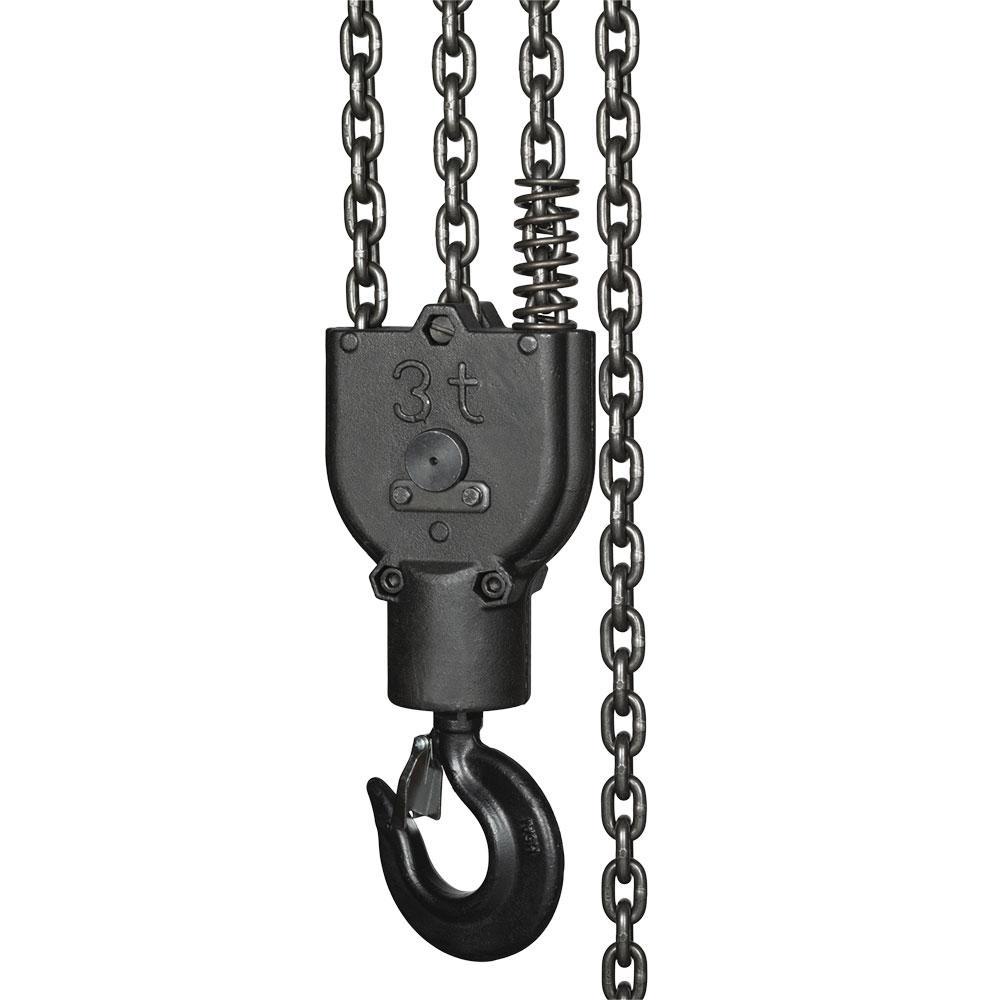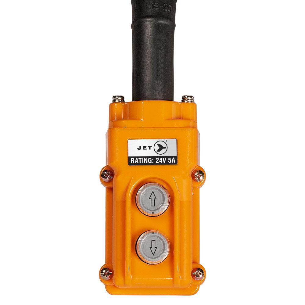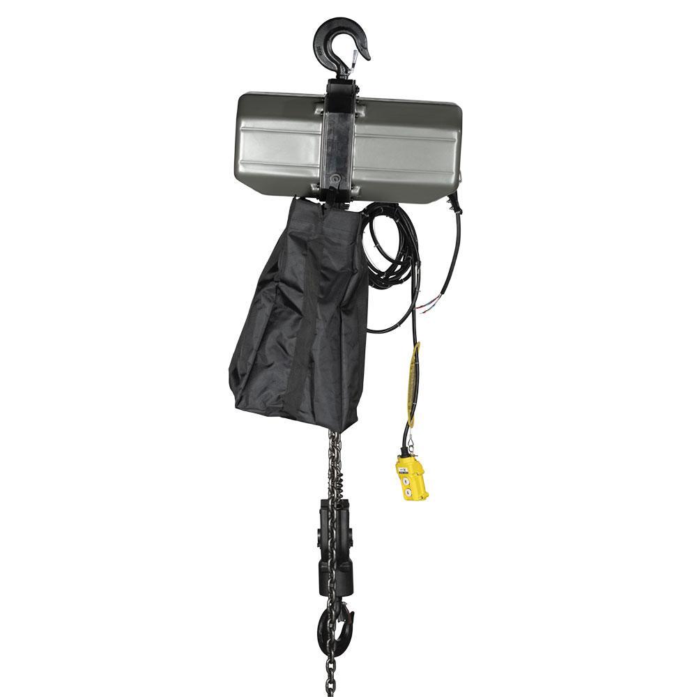24 V Push-button controller with cable strain relief system for durability and reliability Grade 80, black oxide-coated load chain for durability Heat-treated alloy steel geared drive train for long-lasting durability Upper and lower limit switches increase safety by preventing the load chain from over-travelling Equipped with slip clutch overload protection mechanism that prevents the hoist from lifting loads above its rated capacity Available in single or three-phase configurations to suit your electrical needs Maintenance-free gear train with sealed oil bath eliminates maintenance DC electro-magnetic brake holds the load even when power is interrupted Available in 1/2-Ton to 5-Ton capacities with 20 in standard lift (custom lifts available)
