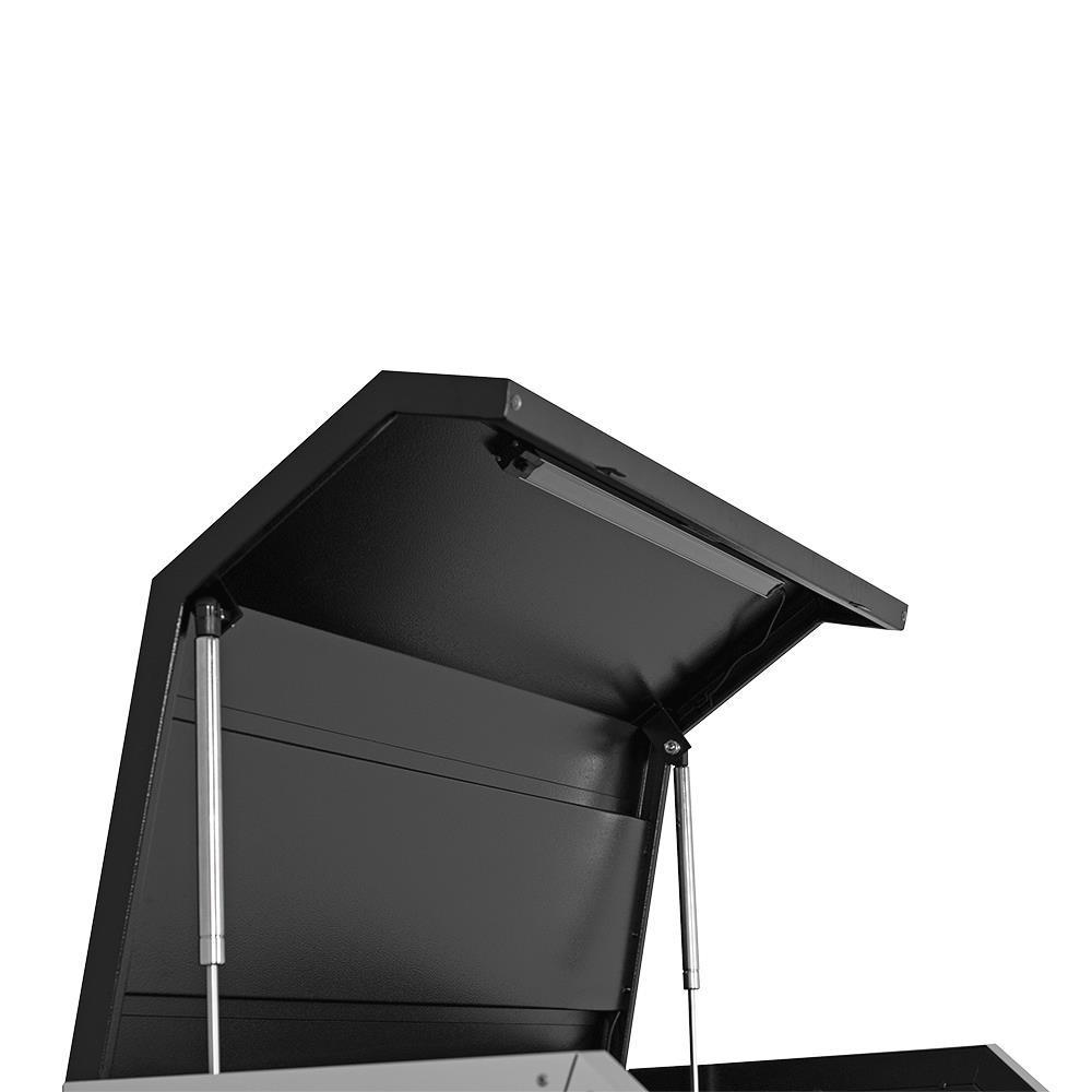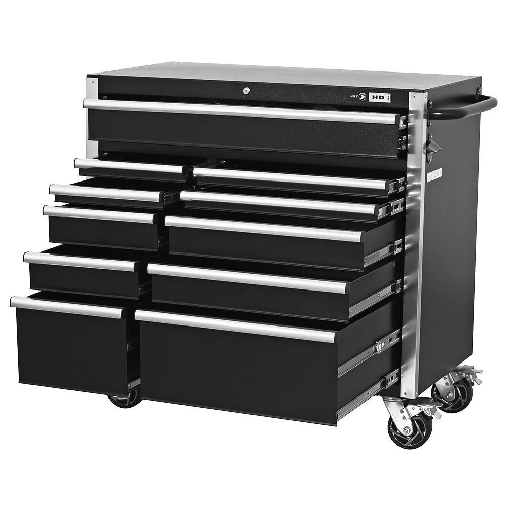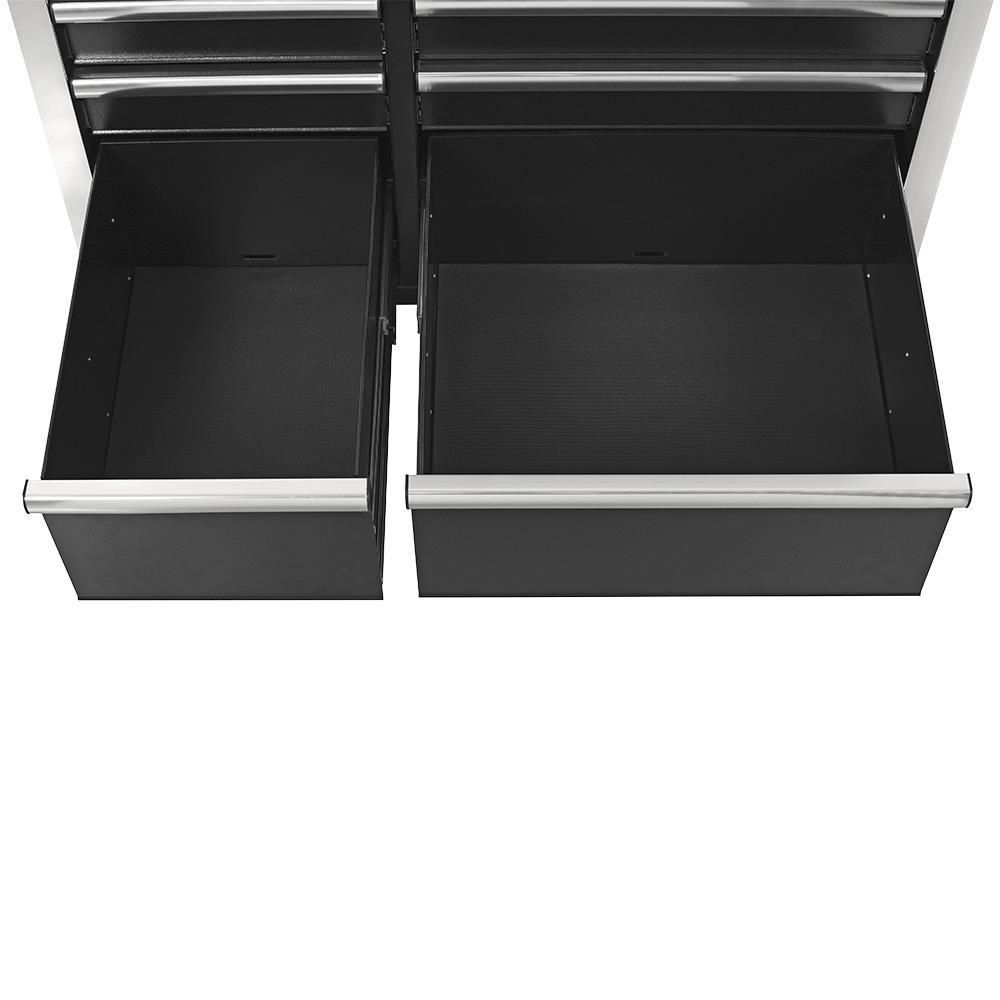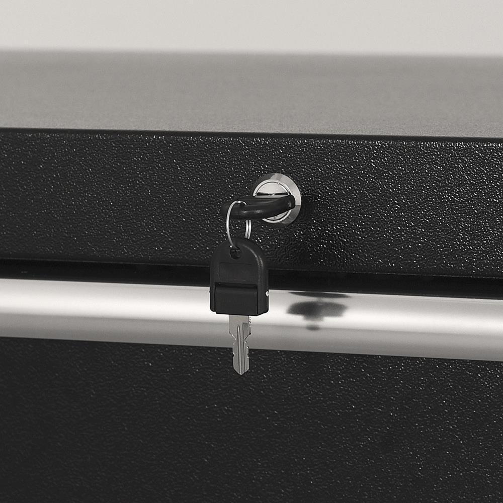 Made with a 19 ga double wall steel construction to withstand the heaviest loads Tough and durable oven-baked wrinkle finish is resistant to corrosive fluids and easy to maintain Riveted aluminum mouldings protect box corners from impact while providing rigidity and strength Soft-close ball-bearing slides provide smooth and quiet operation even under heavy load Heavy-duty casters with pedal lock provide easy transport Comes with 6 power and 2 USB outlets Fold-away pegboard tool wall keeps your most popular tools always within reach (model HDWB-6110) Gas Shocks Internal locking mechanism Pass-through grommets