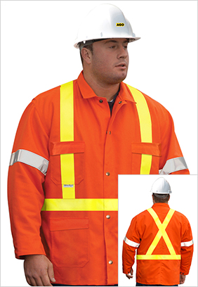 2" wide yellow reflective tape stitched to the jacket in positions as follows: