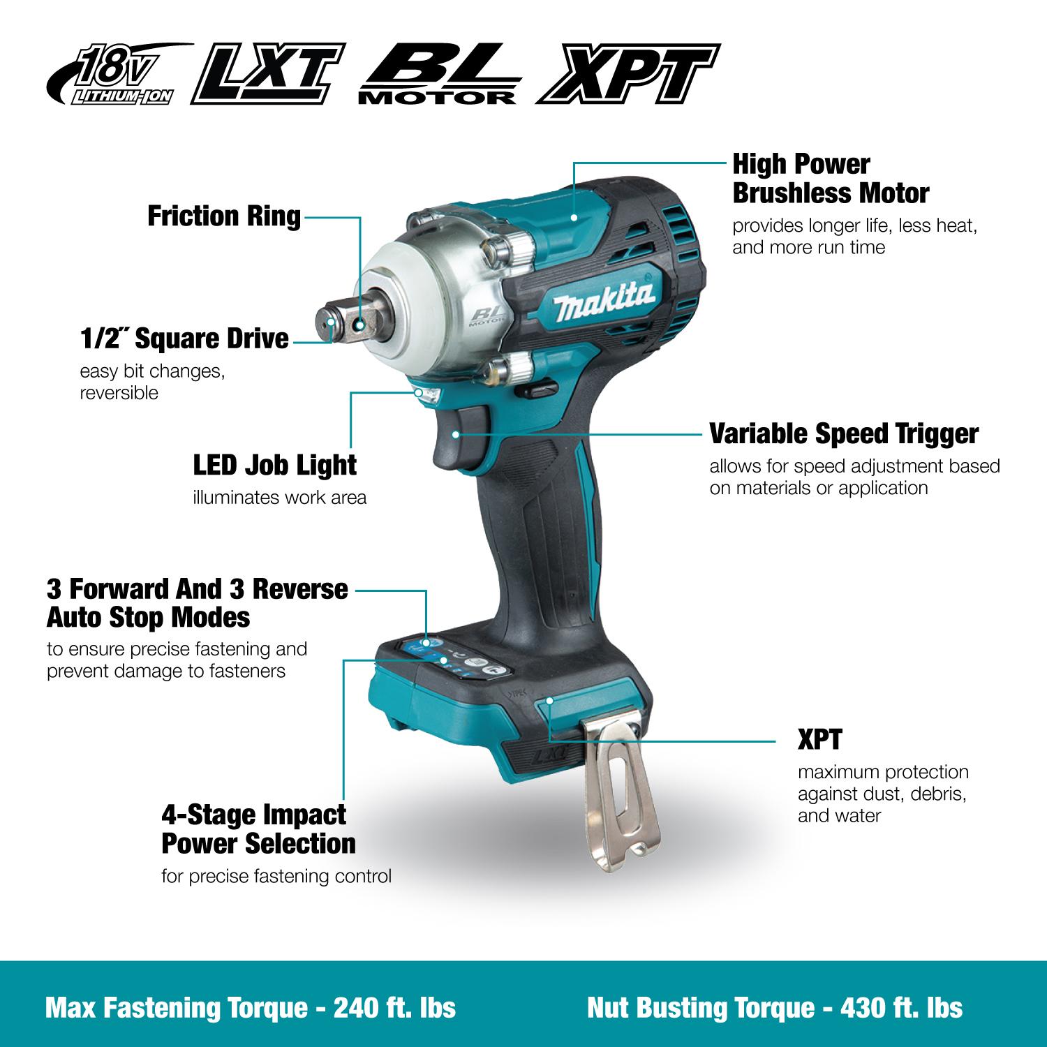 Brushless DC motor with high power to weight and size ratio Brushless DC motor generates less heat buildup and is ideal for prolonged use in manufacturing / production applications Shielded motor suitable for use in high-voltage environments and applications 4 stage impact power selection ensure precise fastening and prevents damage to fasteners or materials 3 forward and 3 reverse auto stop modes stop impact and rotation at pre-set levels to ensure fastening accuracy and prevent over/under tightening of fasteners Variable speed trigger with full speed mode features shorter trigger travel for reduced operator fatigue eXtreme Protection Technology (XPT) offers maximum protection against dust, debris and liquids for optimal performance in extreme conditions Battery protection system provides over-discharge, temperature and circuit protection for enhanced performance, battery cycle life and overall battery life Twin LED job light with pre-glow and after-glow feature and independent on/off switch