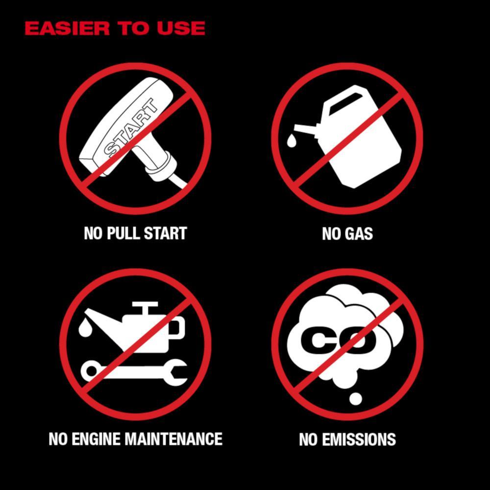 Efficient & Quiet Portable Power Anywhere Part of the MX FUEL Equipment System Pure Sine Inverter Protects Sensitive Electronics No Emissions and Durable Role Cage, Indoor or Outdoor Use Ground Fault Isolated for Jobsite Use Powered by 1 Battery or 2 to Double the Runtime Integrated Charger to Charge up to Two MX FUEL Batteries Push Button Start. No Pull Starts. Compact Footprint for Use in Any Workspace 3600 Peak Watts and 1800 Running Watts for High Draw Tools