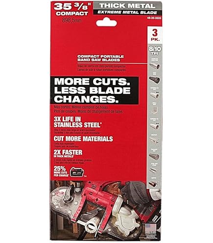 More cuts, less blade changes 3X life in stainless steel and other extreme metals Fastest cutting blade in thick, hard metals Aggressive tooth design for 2X faster cuts in thick metals 25 Percent More cuts per charge Variable TPI, cuts more materials Optimized tooth design for clean cuts One blade for all metal thicknesses 44-7/8 in length - fits any saw this size