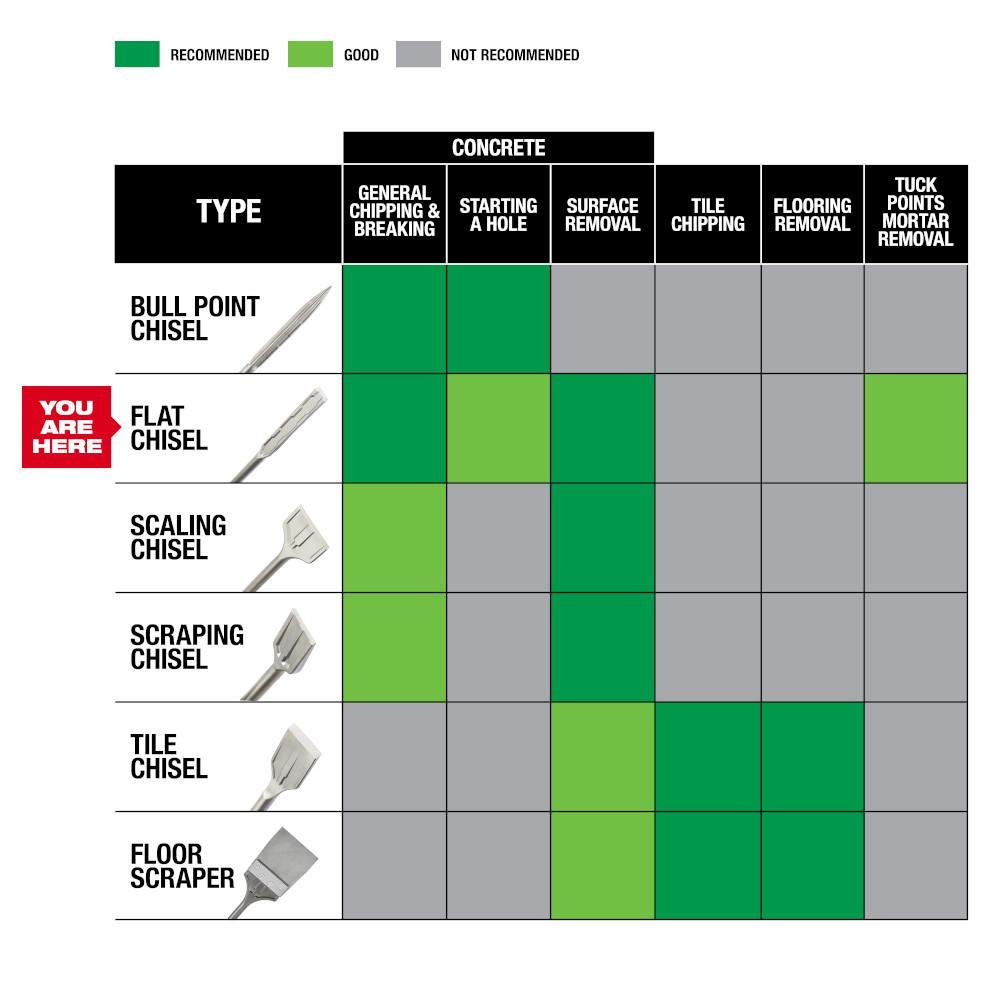 Flat tip is ideal for general demolition and surface cleaning in brick, block and concrete Designed for SDS Max rotary hammers Use in hammer only mode Milwaukee SLEDGE Chisels, Longest Lasting Most Productive Longer tip length for maximum life over standard Milwaukee chisels Reinforced edges delivers maximum durability and reduced wear over the life of the chisel Engineered to maintain sharper edges for increased productivity No re-sharpening or re-hardening necessary for reduced down time High grade forged steel for maximum durability