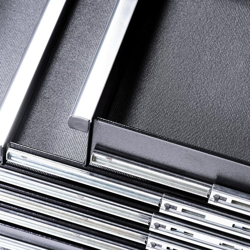 Made with a 19 ga double wall steel construction to withstand the heaviest loads Tough and durable oven-baked wrinkle finish is resistant to corrosive fluids and easy to maintain Riveted aluminum mouldings protect box corners from impact while providing rigidity and strength Soft-close ball-bearing slides provide smooth and quiet operation even under heavy load Heavy-duty casters with pedal lock provide easy transport Comes with 6 power and 2 USB outlets Fold-away pegboard tool wall keeps your most popular tools always within reach (model HDWB-6110)