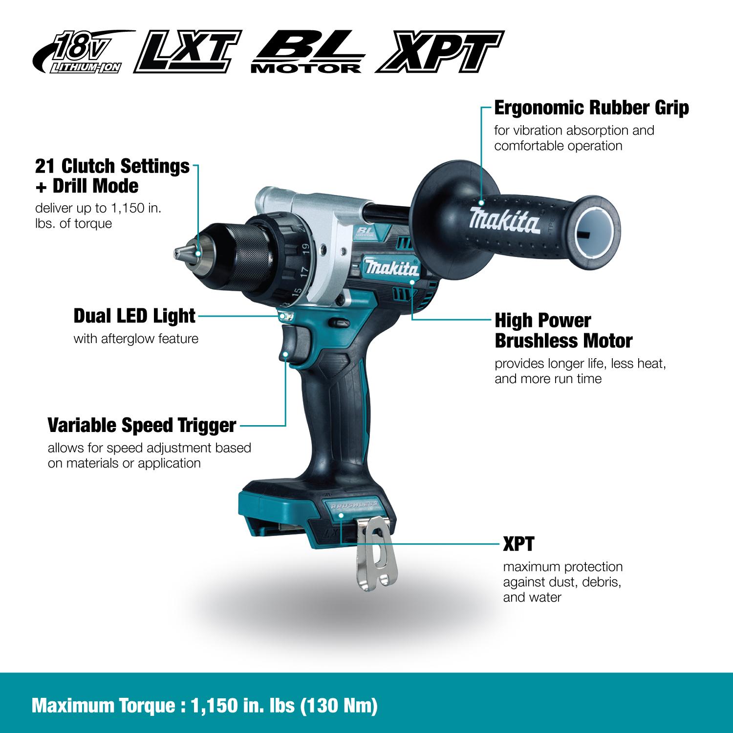 Brushless DC motor with high power to weight and size ratio Brushless DC motor generates less heat buildup and is ideal for prolonged use in manufacturing / production applications eXtreme Protection Technology (XPT) offers maximum protection against dust, debris and liquids for optimal performance in extreme conditions Battery protection system provides over-discharge, temperature and circuit protection for enhanced performance, battery cycle life and overall battery life All metal gears for more efficient power transmission Ultra-compact design (only 7 in long) Dual LED job lights with afterglow feature Ergonomic soft rubber grip design for vibration absorption and comfortable operation features re-contoured rear grip portion and ribbed grip for improved hold